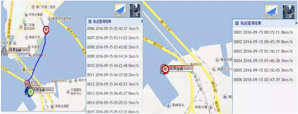 9月15日7:00超級臺風(fēng)“莫蘭蒂”剛過,廈門漁港監(jiān)督局接到“廈門環(huán)海灣休閑漁業(yè)公司”求助,漁業(yè)公司9月14日進入高崎漁港并停泊在港區(qū)北口門水域避風(fēng)的4艘休閑漁船 有2艘“失蹤”,漁監(jiān)人員立即趕到現(xiàn)場勘查,兩艘休閑漁船受損,其余兩艘休閑漁船不見蹤跡,水面無明顯漂浮物。漁業(yè)公司船只裝有我司自有研發(fā)的“太陽能定位裝置”,漁監(jiān)局通過我司平臺“北斗之星 ”調(diào)取安裝在該船的“太陽能定位裝置”的軌跡回放,獲取了船只在9月15日00:00—07:00臺風(fēng)登陸期間的軌跡,軌跡回放顯示“閩廈漁輔30002”漂移5小時約3.5公里,最后定位信號在集美京閩北海灣酒店附近,另外一艘“閩廈漁輔30003”最后定位信號在漁港北口門水域。初步判斷為臺風(fēng)登陸時風(fēng)力過大,繩斷、撞擊等造成一艘沉沒,另外一艘漂走,經(jīng)船主確認和港內(nèi)探摸,與軌跡分析一致。